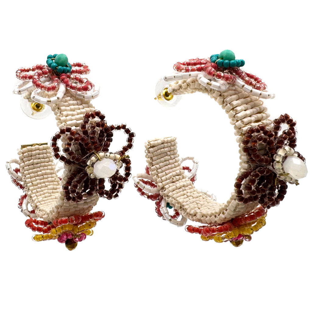 Spring Summer Flower Seed Bead C Hoop Earrings